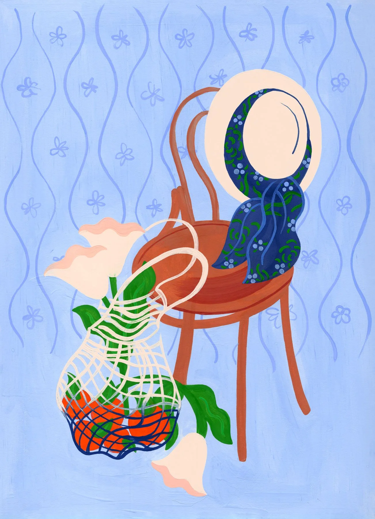 Gouache painted art illustration of a brown chair against a light blue background with floral painted wallpaper. Next to the chair is a knitted bag filled with flowers and oranges and a white hat with a dark blue patterned scarf hangs on the chair.
