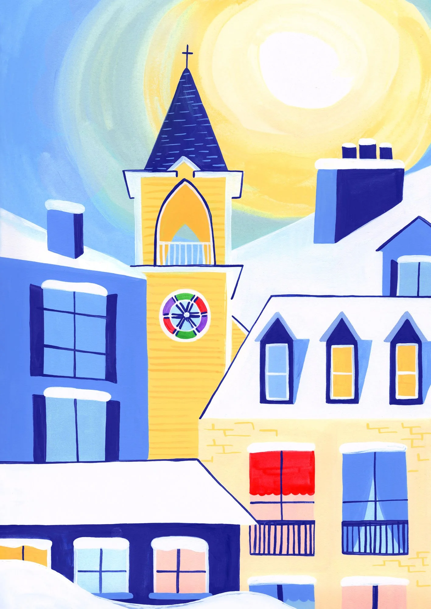 Gouache painted illustration of city rooftops covered in snow as the morning sun rises. There are colorful blue buildings with windows and a yellow chapel in the middle.
