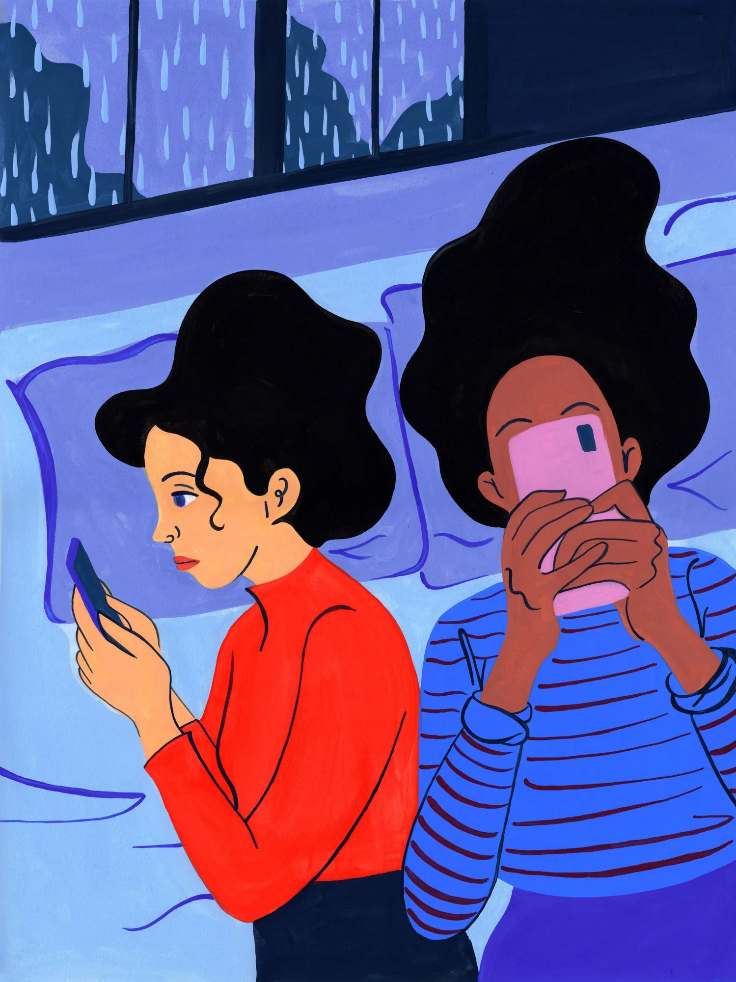 Gouache painted illustration exploring the impact that technology has on our connections with others. Two diverse females lay next to each other at night, both looking at their phones. There is a window showing rain outside.