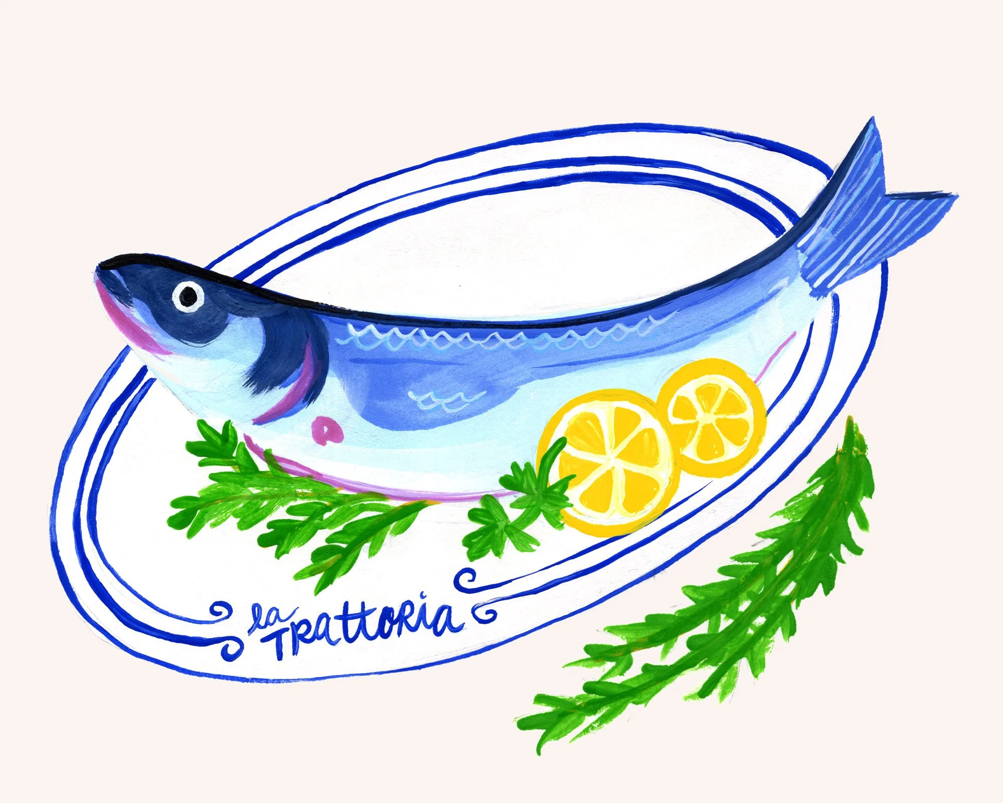 Gouache painted illustration of a blue fish on a plate that says "la trattoria" with lemon slices and green herbs