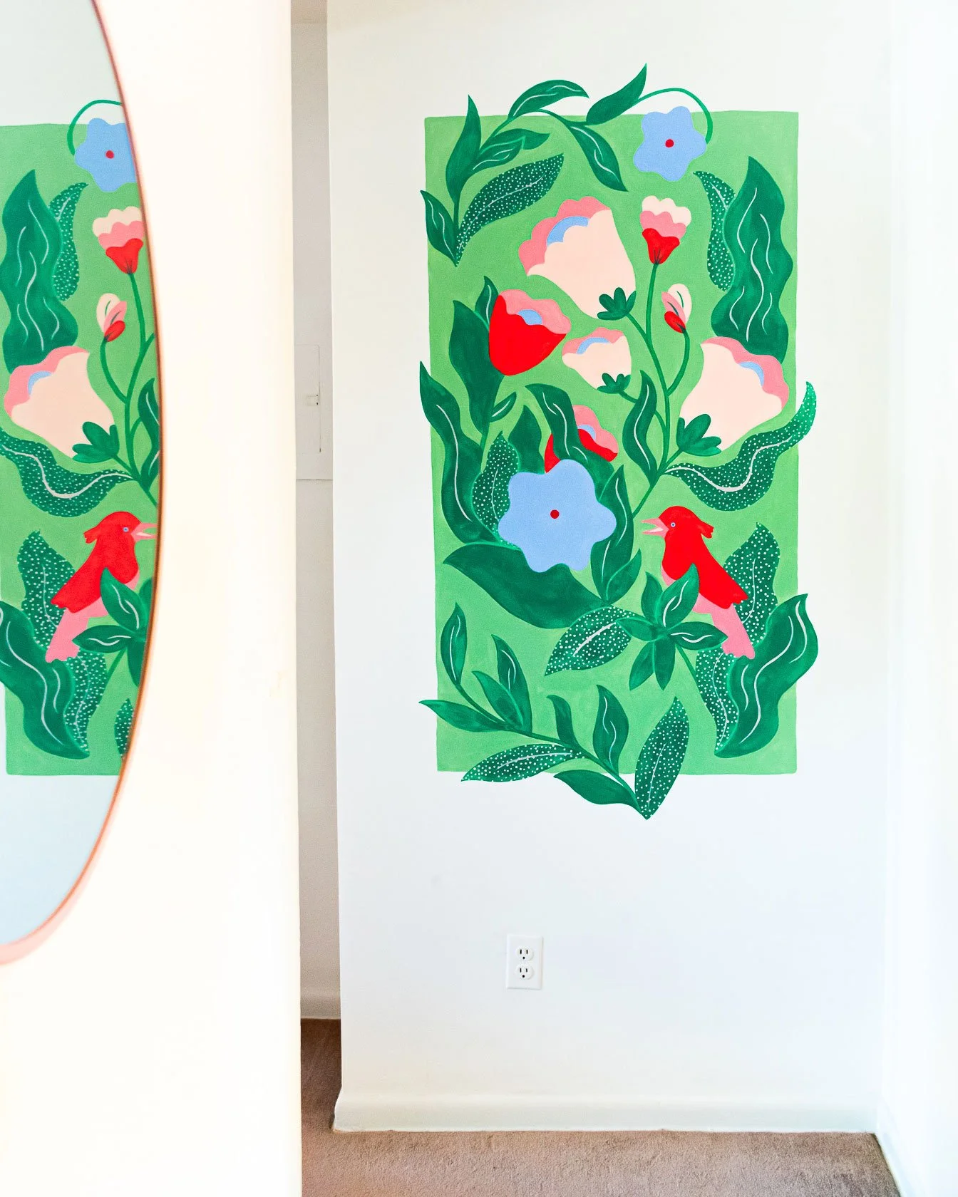 Photo of a painted interior mural of pink, red, and periwinkle flowers with green leaves on a light green background.