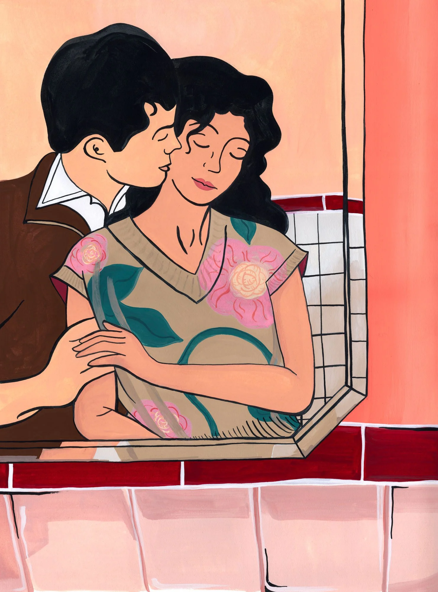 Gouache painted illustration original art of a romantic couple sharing a kiss on the cheek in a pink bathroom in front of the mirror.
